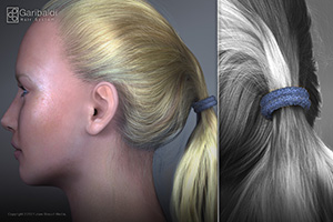 Pony Tail Blonde Female:Complex realistic long-length hair demonstrating simple clumping and building multiple layers of controlled detail.